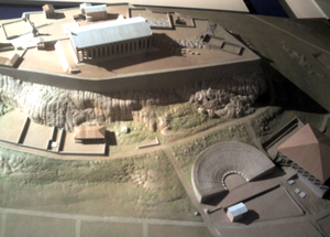 The picture right is a model, showing where the theatre was, just below the Acropolis. |