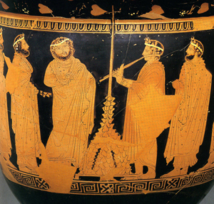 The Dionysia Each year after that a festival of Dionysos (the Dionysia) was celebrated. Young men would dress as satyrs (half men, half goats), wearing masks. Animals were led through the streets to be sacrificed to Dionysos, while people sang hymns to the god, danced, and played musical instruments. These special songs for Dionysos were called dithyrambs, and the group of 12 or 15 singers and dancers, accompanied by flute players, was called a chorus (see above left). In the agora (the market place) the chorus would act out ritual scenes to do with Dionysos. This is how theatre began. Writing Another reason plays were invented is that Greeks started writing. They invented their alphabet about 600 BC, and this allowed them to write down plays. Now, a playwright could write down an exact set of words, and an actor could memorise them by reading them. Before, story tellers would sing their stories and others would have to learn just by listening. This was very hard to do so stories kept changing as people forgot some bits and added others.