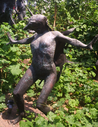 Maenads would run through the woods in ecstasy, playing music, and tearing apart wild animals and eating them raw. All of this is described in Euripides' play, The Bacchae. The sculptures are in a field of vines, which is appropriate as Dionysos was the god of wine. |