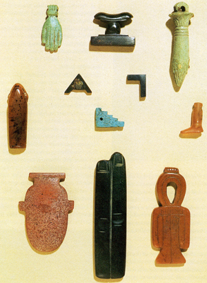 Left: an assortment of amulets including a hand, headrest, papyrus, fingers, heart, and objects used during the burial rites.