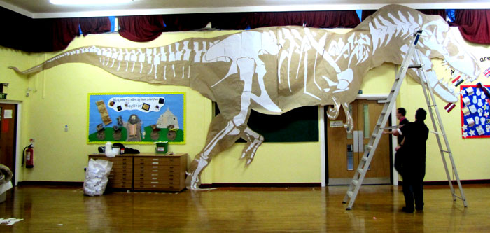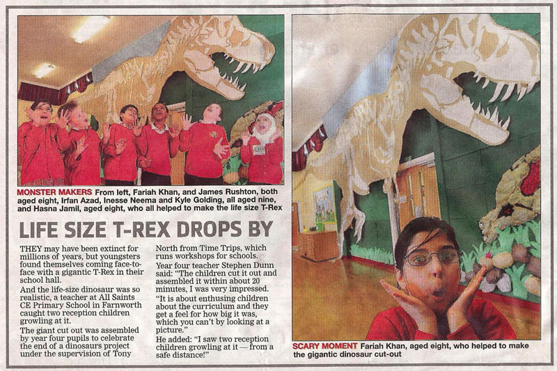 ![]() The finished T rex - 12m long and 4m high The picture below was taken by the Bolton News: ![]() Article in the Bolton News, Feb 2012, about a Fossils and Bones workshop at All Saints Primary, Bolton Note - the T rex takes about 120 minutes, not 20! ![]() T rex making at Norris Bank Primary, July 21st 2011