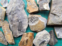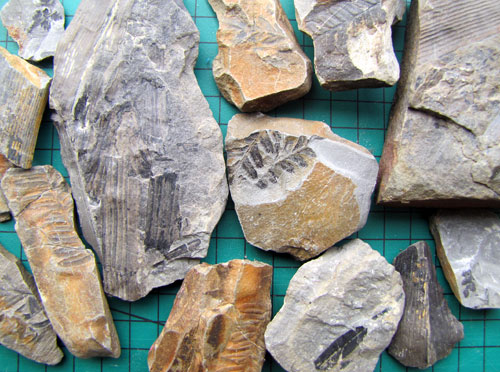 8. Plant fossils - various species, mainly ferns, tree roots and horsetail stems. Carboniferous, about 320 million years old. Found by me at New Hey Quarry, Rochdale, Shaly Dingle near Bolton, and Poise Brook, Stockport. |