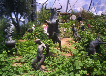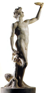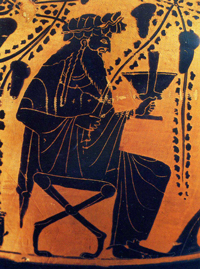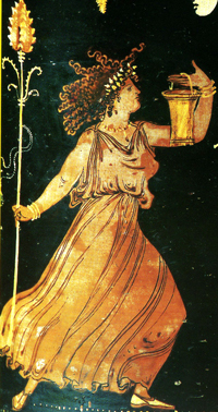 right: a priestess of Dionysos. She carries the thyrsus, the sacred wand wreathed in ivy and topped with a pine cone. Click here to see a sculpture of maenads at the Eden Project. | At first Dionysos was not one of the gods of Olympus but he became so important he was allowed a special place there. |