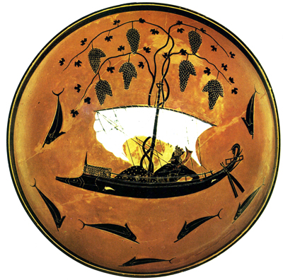He is usually shown with grapevines around him, or in his hair, and a cup of wine in his hand. Myths of Dionysos Once Dionysos was travelling in a ship and was captured by pirates. He turned the mast into grapevines, the oars into snakes, and the pirates into dolphins (see the picture on the kylix left). Dionysos once punished Lycurgus, a king who refused to let him pass through his lands and imprisoned his followers. Dionysos miraculously freed his followers of their chains, and drove the king mad. Lycurgus chopped off his son's legs and one of his own, thinking he was cutting grapevines. The god also sent a severe drought on his land. |