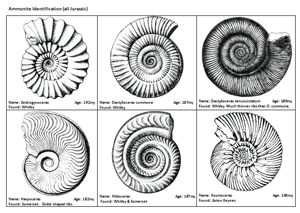 Fossil ID Game: Children choose from a collection of different species of one type of fossil - ammonites on one table, trilobites on another, and plants on the other. Using a picture guide (see above) they identify the species. They then draw the fossil as accurately as possible. At the end the 4-6 children who do the most accurate drawings will get a free fossil.