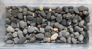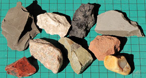 In 6 groups children handle their own set of the same 8 rocks, and identify them with the aid of a hand lens and a descriptive guide. The rocks are: limestone, sandstone, shale, flint, coal, basalt, granite, obsidian.