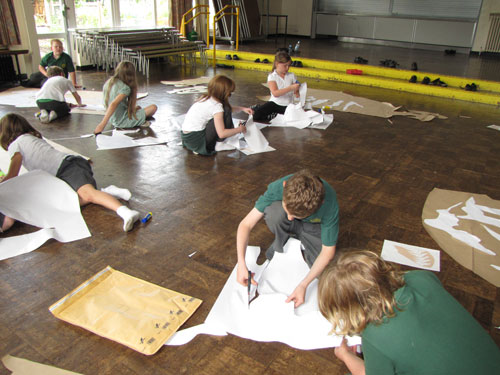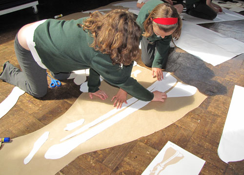 Following a useful classroom presentation on the skeleton, Tony took the children into the hall where they worked for the rest of the afternoon as paleontologists slowly uncovering the remains of an enormous prehistoric dinosaur. In small groups, differentiated according to the ages and abilities of the children in the class, they drew from stencils, cut out and assembled a myriad of paper bones which were then arranged to form the dinosaur skeleton. I was impressed with the level of engagement the children showed on a complex and demanding task over a lengthy period. They also worked cooperatively, both within the small groups working on different parts of the dinosaur and as a class piecing the parts of the whole together.