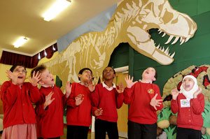 'The children at our school were amazed to arrive one morning in the last week of term to see a life-sized Tyrannosaurus rex prowling across the back of our school hall. This beast had been put together the previous afternoon by children in Year 4/5 as part of a workshop delivered by a regular visitor to our school, Tony North. In the past Tony has delivered engaging and hugely popular curriculum workshops on historical topics but none of us were quite ready for his latest idea.
