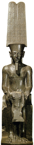 Amun Amun was the king of the gods in the New Kingdom. His main temple was Karnak, but the Luxor Temple and Hatshepsut's temple were dedicated to him, plus several others. His name means 'the hidden one'. In the New Kingdom he was joined with the sun god Re to become Amun-Re, the creator god and father of the pharaohs. Pharaohs also began claiming that Amun was their father. Inscriptions in Hatshepsut's temple portrayed her divine birth, which helped to strengthen her position as a female pharaoh. Amun was worshipped mainly by the high priest who would look after his cult statue in the inner sanctuary of his temple. The statue would have been made of solid gold - unfortunately none have survived, although we do have some statues of Amun made of gold and silver. The priest would make offerings of incense, food, flowers, wine and beer; he would anoint the statue with perfumes and incense; he would wash it with holy water; and he would clothe it in fine linen. A lector priest would also read out prayers and spells to bring the statue to life and ask it for its blessings. Amun was shown as a man with two ostrich plumes on his head.