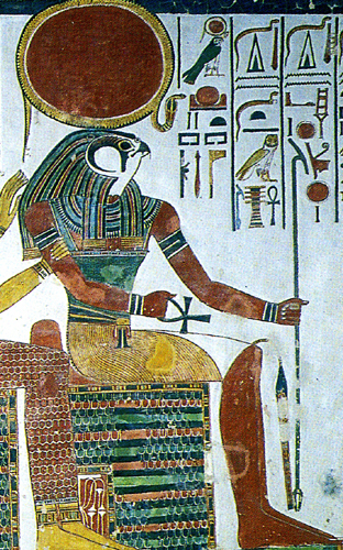 Later he was often shown with a falcon's head and the sun on his head with a snake wrapped round it. In this form he is connected to Horus, and known as Re-Horakhty (Ra, Horus of the Horizon).