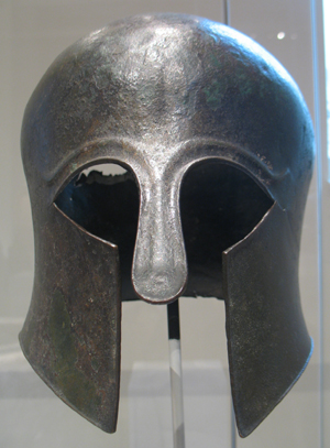 Helmets A hoplite was also protected by a helmet, usually made of bronze. There are many kinds. Most had a crest on top - a row of horsehair meant to look like a horse's mane, to help scare the enemy. The helmets we have in museums lost these crests long ago. The pictures to the right show two examples of one of the most popular kinds of helmet - the Corinthian. The re-enactors above are all wearing Corinthian helmets. These helmets gave very good protection but reduced vision and hearing quite a lot. They must have also made the wearer pretty hot! Later on a hole was cut for the ears so hoplites could hear better. A cloth cap was also worn inside the helmet to soften blows to the head. Crests were often brightly coloured and patterned - see the vase painting below.