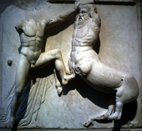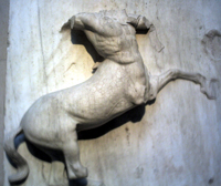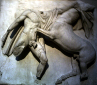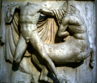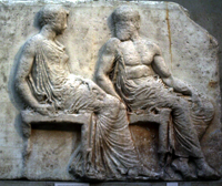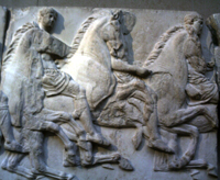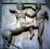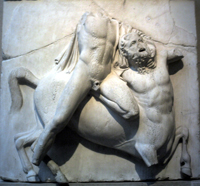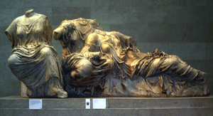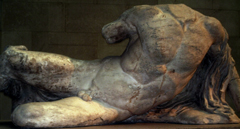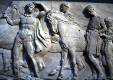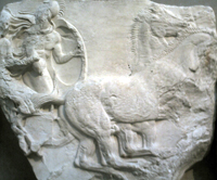 The pediments on the Parthenon showed the gods on Olympus on one end, and the contest between Poseidon and Athena to be the god of Athens on the other. Only fragments remain. They are all of gods, and some horses.