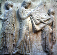 The frieze on top of the cella showed the procession of the Great Panathenaia, a festival for Athena held every four years. Animals were led to sacrifice, other offerings such as wine were carried, people rose horses, sang, danced, and played music. One part of the frieze shows the gods of Olympus.