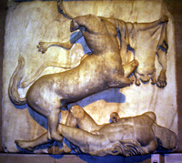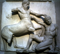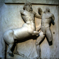 The metopes were square sections from the entablature carved with mythical scenes. The metopes in the British museum show the fight between the Lapiths and the centaurs (half horse, half men). Some are very beautifully carved.