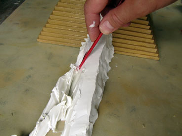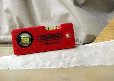 Children will also be careful that the ramp they build is smooth enough for the blocks to be pulled up; that it's at the right angle all the way along (about 7.5 degrees, measured using the spirit level you see in the photo above right); and that it's not too steep on the sides (to avoid collapse of the ramp). Also a line is marked on the board (see photo right) to show the location of the quarry - in other words, the point the ramp cannot go past. Children will try to find out how high up the pyramid the single ramp could go. If done properly the answer should be 6 or 7 levels (as you can see in the photo). Most groups will only have time to test the single long ramp theory. A more able group could test another theory such as the spiral ramp, to see how much plasticine that uses (answer - a lot!). This activity not only gives children an understanding of the difficulties in building the pyramid ramps, including the need for a stable and useable structure, it helps them to learn about angles, and also gives them practice in clay modelling skills.