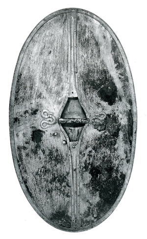 Celtic Shields Like the Romans, and most ancient warriors, the Celts used shields in battle. These were usually oval, as the photo on the right shows (this is the back of a shield), but they could be rectangular, circular, or hexagonal. On the front was a boss - a metal cup to protect the hand behind, which was holding the handle. The shields were made of wood (often oak) and stood about 1.1m high. They were about 1.2cm thick in the centre, and overall weighed about 6kg. They were covered with leather (or felt), as bare wood would splinter when struck with a weapon. The shields were usually decorated with various designs, which can be seen on stone carvings and other pictures (see bottom of the page).