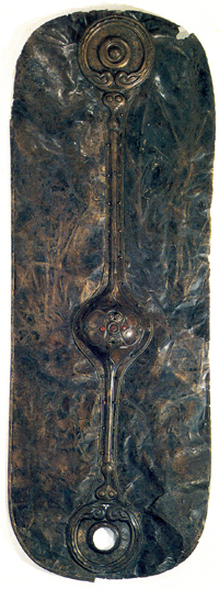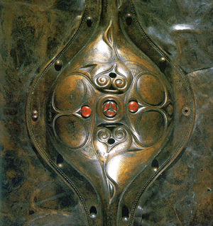 ![]() The most famous Celtic shield is the Battersea shield, found in the River Thames at Battersea. Sometimes objects like shields and swords were thrown into rivers as offerings to a god. The Battersea shield is an amazing work of art, the most famous piece of Celtic art ever found in Britain. It is made of bronze and enamel (coloured glass). Originally it had a wooden back, but only the bronze is left now. However, it is too small (77cm high), fragile, and expensive, to have ever been used in battle, and was most probably just an offering. The same goes probably for another famous shield, the Witham shield. Another wonderful piece of Celtic art can be seen in the Wandsworth shield boss, which has lost the wooden main part of the shield, but is a beautiful set of swirling shapes whose meaning we can only guess at - leaves? bird's heads?