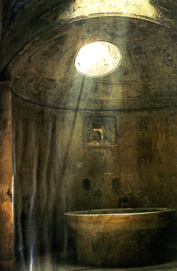 After this the visitor would close his pores again in the frigidarium, and be rubbed down with oil.