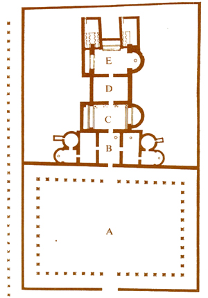 First was A, the palaestra, an open courtyard for exercising. Then the visitor entered the changing rooms, B, where he left his clothes. Next was C, the frigidarium, or cold room. Here the visitor had a cold bath to wash off most of his sweat and dirt. Next was D, the tepidarium, or warm room.