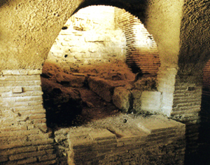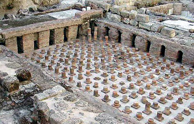 Hypocaust under the floor of the baths in Beirut, Lebanon. The air entered through the door-like spaces in the sides.