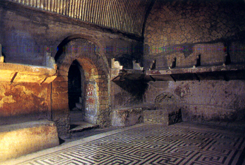 One of the cleverest features of Roman baths was their heating. The caldarium and tepidarium were heated by furnaces burning wood to heat enormous tanks of water to supply the hot water and the steam. Also, there was a hypocaust system - that is, furnaces heated air which was directed into a space under the floor of the hot rooms. The floors were supported by short pillars, which you can see in many Roman baths, and also some houses. The cooler temperature of the tepidarium was a result of it being further away from the furnaces.