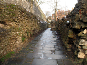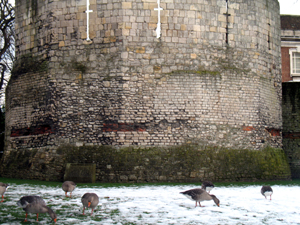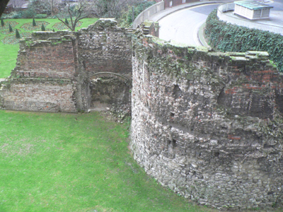 The multiangular tower at York. The Roman part is the lower layer with smaller stones - above this is the medieval section. |