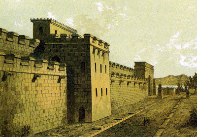 Reconstruction of the walls of Pompeii, showing a tower and a gateway. |